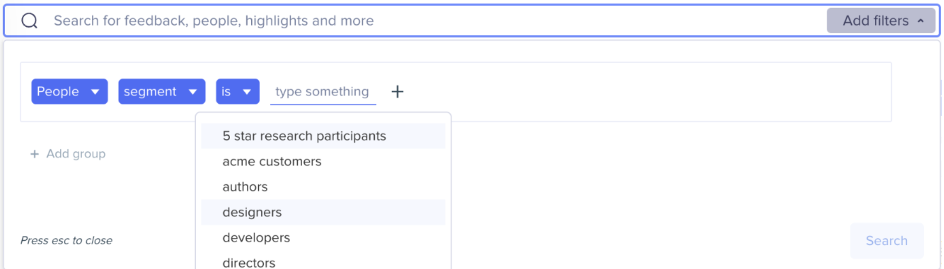 - Use customer segments to organize and group Customer Profiles by attributes such as associated personas, behaviors, demographics, frequent features used, etc. Remember, the context of the feedback can be just as important as the feedback itself.