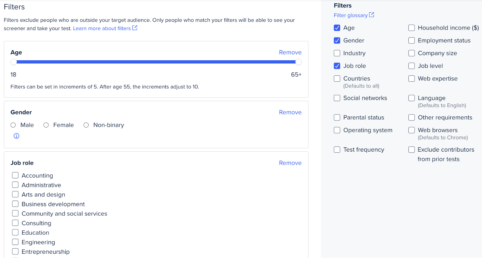 - If you have more than one group of target contributors, you can add multiple audiences to your test with different criteria and screener questions.