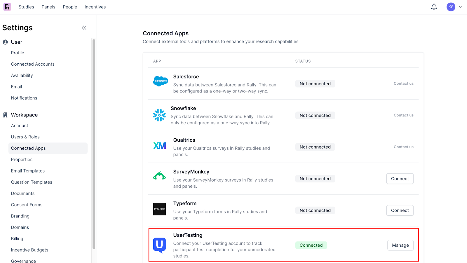 UserTesting allows users to set up a connection between their Rally and UserTesting accounts. This connection allows us to send notifications to Rally when a participant completes a test.