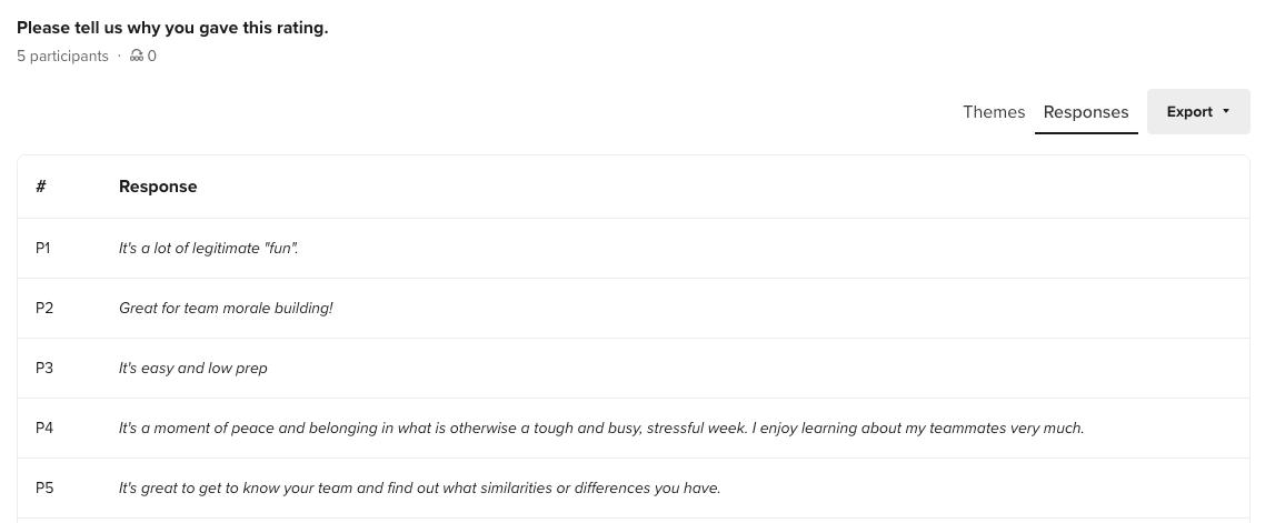 - If participants provided a reason for giving that rating, it will appear as a list of their responses.