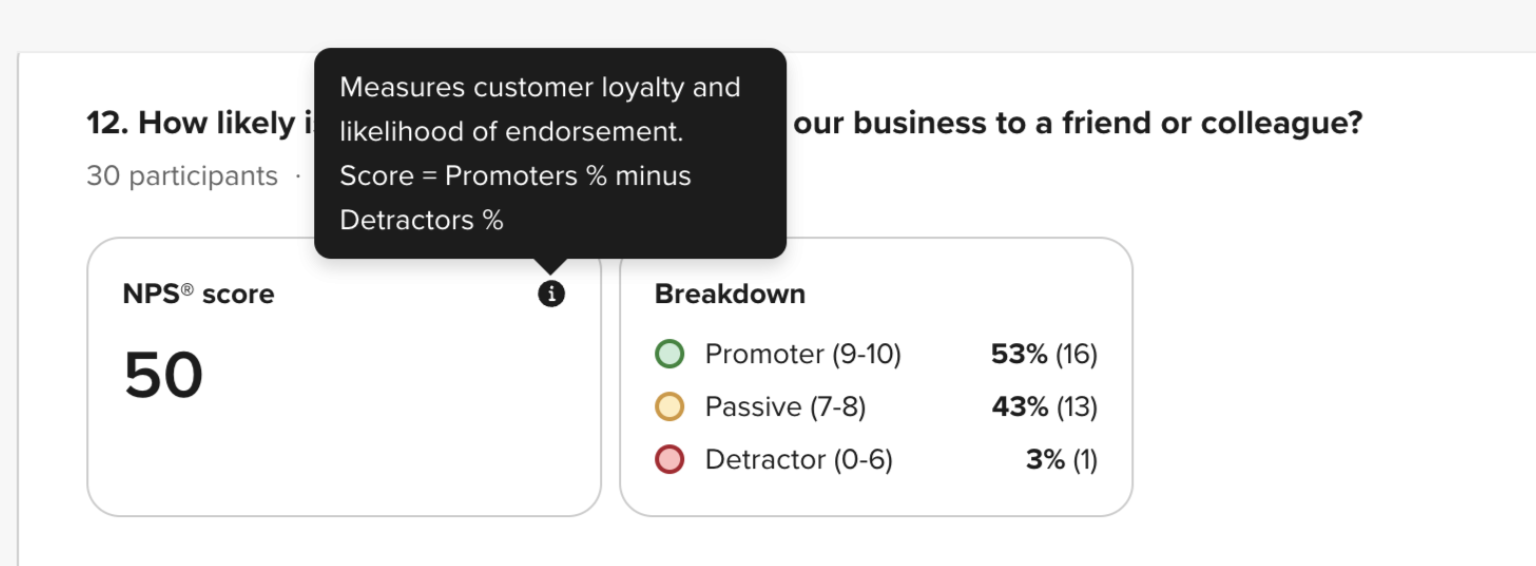 - Automatically categorize responses into Promoters (9-10), Passives (7-8), and Detractors (0-6) based on the score provided.