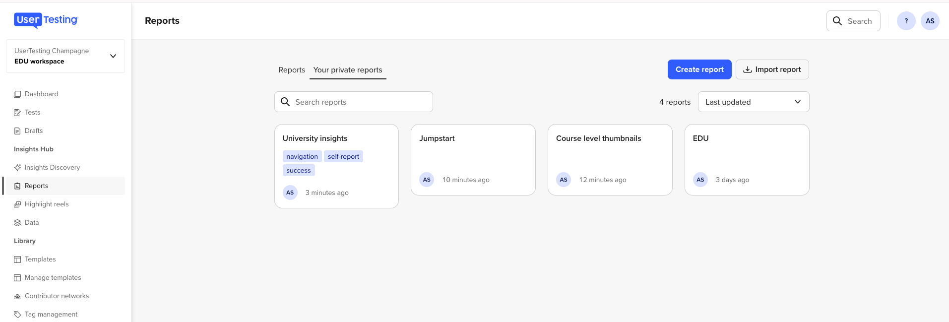 A UserTesting Report will be created for every file you select and upload using the “Import report” button. You can import one or multiple .odt, .md, .pdf, .docx, .pptx, .odp files from: