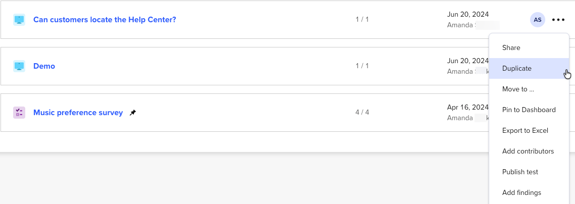 • Duplicate and convert: Creates a new unmoderated think-aloud test using the content from your original test in the updated experience.