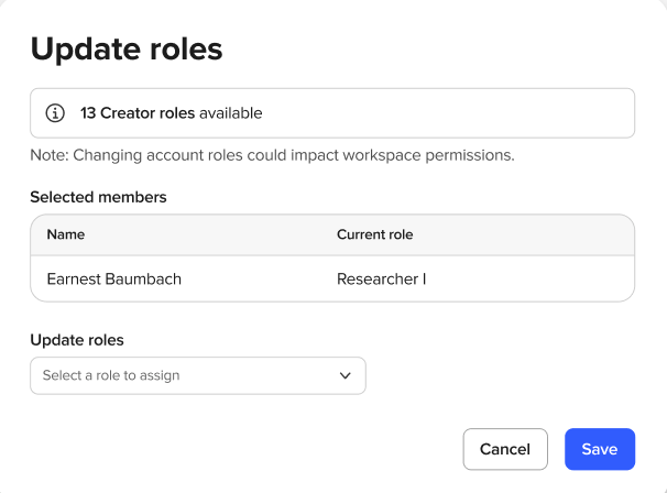 - If your account doesn't have any available Creator seats and you attempt to assign a member to a Creator or Custom role, the action will not be completed.