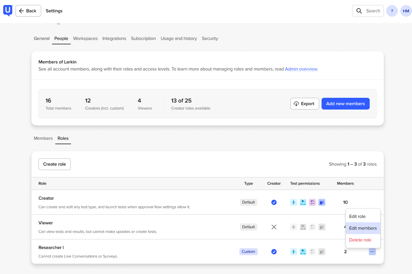 You can edit existing members assigned to a custom role directly from the Roles page.
