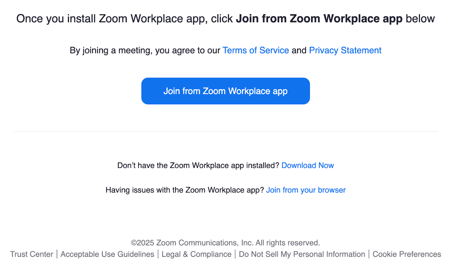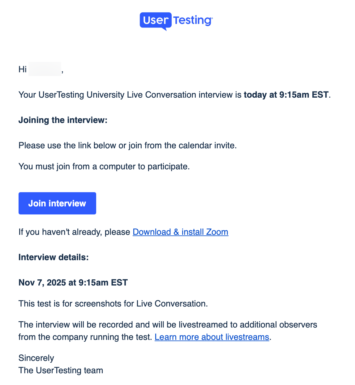 - If the contributor didn't download and install Zoom prior to the meeting start, they’ll be prompted to do so once they select the Join interview button from their email.