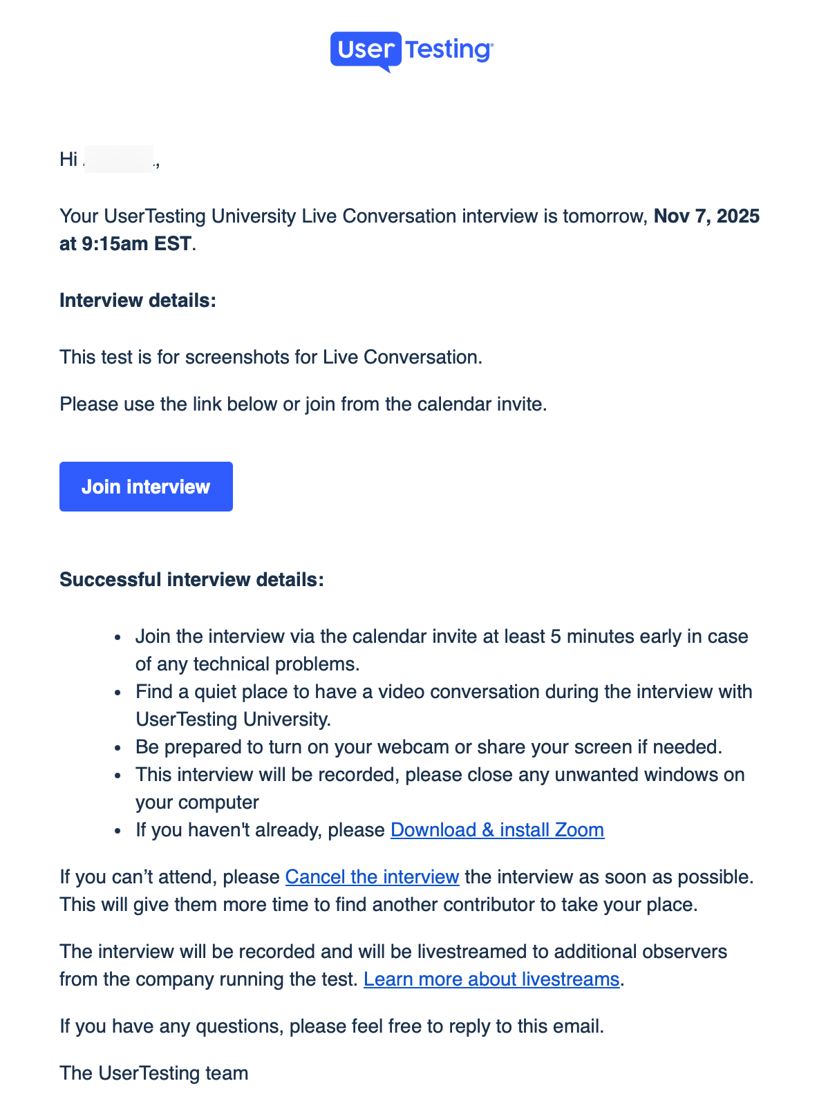 - Clicking the Join interview button launches Zoom.