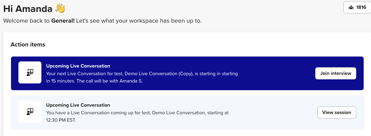 - The Join Live Conversation button appears 15 minutes before the session starts.