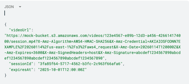 - This endpoint returns a pre-signed URL that enables time-limited access to download a session video file.