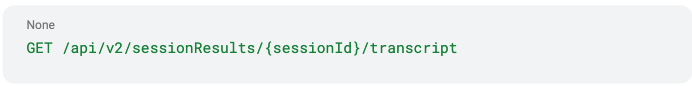 This endpoint returns a WebVTT 1.0-compliant transcript for a specific session. It provides human-readable captions and supports integration with video players and analytics workflows.