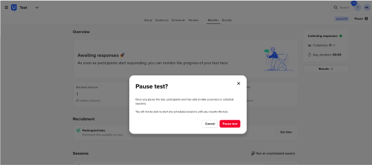 Note: When a test is paused, participants cannot join scheduled or unscheduled sessions because the test is offline. Be sure to resume the test before any upcoming sessions to avoid no-shows.