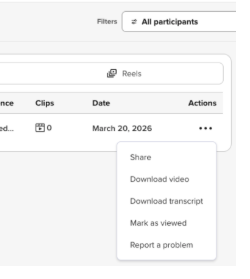 - In the video recording, you see an AI-generated summary of the session, the ability to generate clips, search the transcript, create highlight reels, and more.