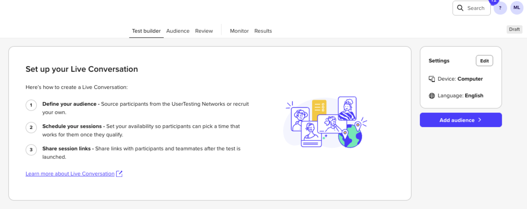 Live Conversation lets you run moderated, real-time sessions with participants. Use it to ask follow-up questions, observe behavior live, and explore feedback in more depth. This guide covers how to create, schedule, and run sessions, plus key workflows and experience differences. |