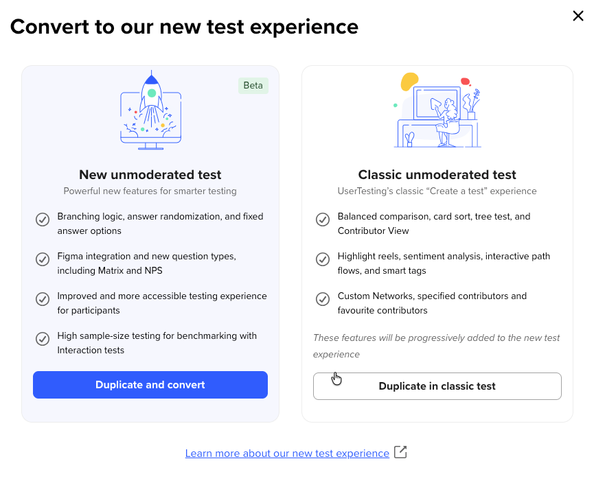 If your test relies on features not yet supported in New TOL (such as card sorting, templates, or app testing), consider continuing to use Classic TOL.