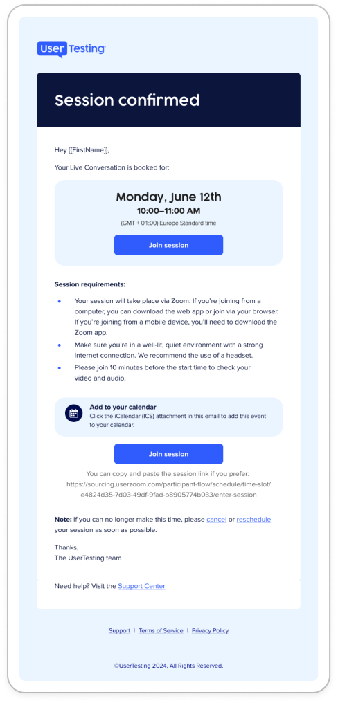 Participants can join their session using the link in their confirmation or reminder email, or from the calendar (.ics) invite.