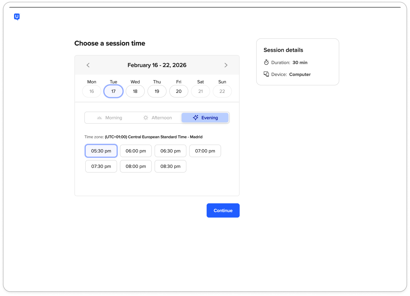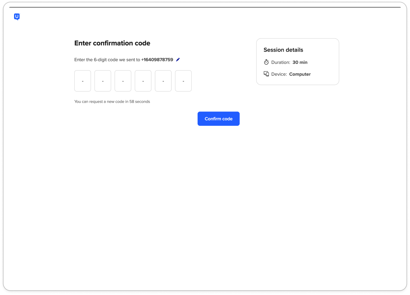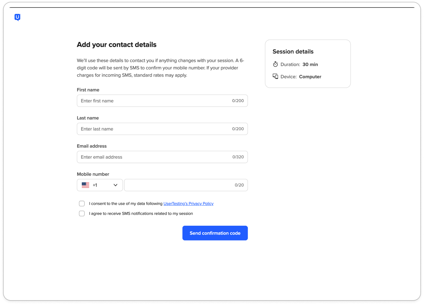 - Participants provide and verify their phone number during scheduling, enabling SMS reminders and improving session reliability.