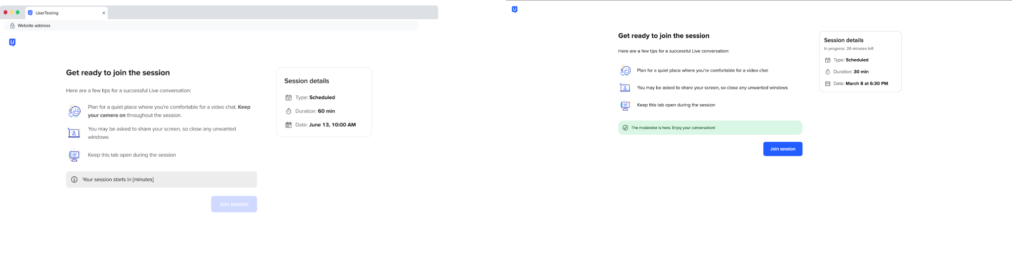 - The Join session button becomes available once the moderator begins the session.