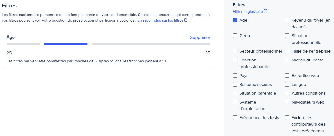 Les informations démographiques sont collectées dès qu'un contributeur s'inscritau Réseau de contributeurs UserTesting. En sélectionnant des filtres démographiques pendant l'étape de ciblage, vous contrôlez la distribution de votre test. Seuls les utilisateurs qui correspondent aux données démographiques <sélectionnées pourront="pourront" accéder="accéder" à="à" votre="votre" test.="test."></sélectionnées>