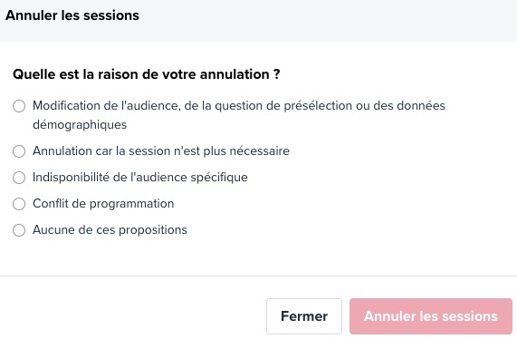 Si tu annules une session de Test Modéré en cours, tu peux aussi en choisir la raison :