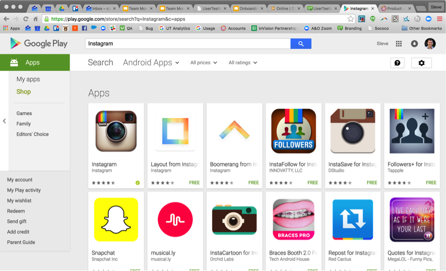 - Recherchez l'appli souhaitée dans le Google Play Store. Par exemple, Instagram :